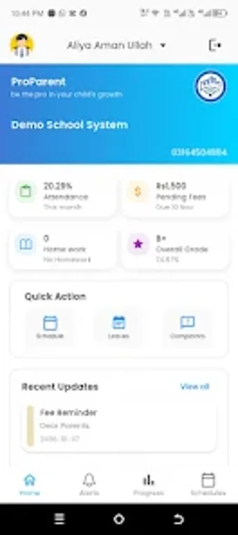 นอกจากการติดตามการเข้าชั้นเรียนและผลการเรียนแล้ว ProParent ยังมีการแจ้งเตือนทันทีสำหรับกิจกรรมและประกาศของโรงเรียน เพื่อให้แน่ใจว่าผู้ปกครองไม่พลาดข้อมูลสำคัญ แอปยังช่วยให้การจัดการค่าธรรมเนียมง่ายขึ้นโดยการให้รายละเอียดเกี่ยวกับโครงสร้างการชำระเงินและวันครบกำหนด โดยรวมแล้ว ProParent ทำหน้าที่เป็นเครื่องมือที่มีค่าสำหรับผู้ปกครอง ส่งเสริมการสื่อสารที่ดีขึ้นกับโรงเรียนและสนับสนุนการเดินทางทางการศึกษาของบุตรหลาน